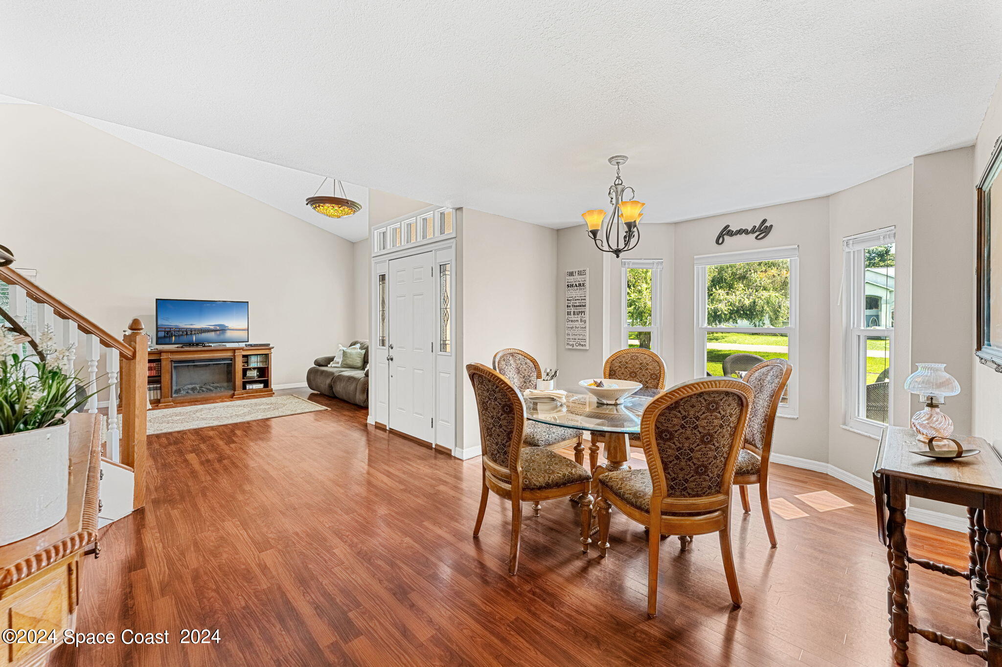 This remarkable residence epitomizes a seamless fusion of modern sophistication and timeless architectural charm, offering expansive living spaces infused with elegance and practicality. As you approach, the freshly painted exterior, complemented by well-maintained landscaping, invites you to explore the home’s thoughtfully designed interior. Upon entry, you are greeted by the warmth of laminate mahogany-colored floors, setting an immediate tone of luxury and comfort. To the right, the open living room showcases vaulted cathedral ceilings and strategically placed skylights, flooding the space with natural light. The room’s hurricane-resistant windows, dressed in white wood blinds, not only enhance safety but provide a serene connection to the outdoors. A sleek, modern ceiling fan adds a touch of contemporary flair to the space, making it perfect for both casual family relaxation and more formal entertaining.