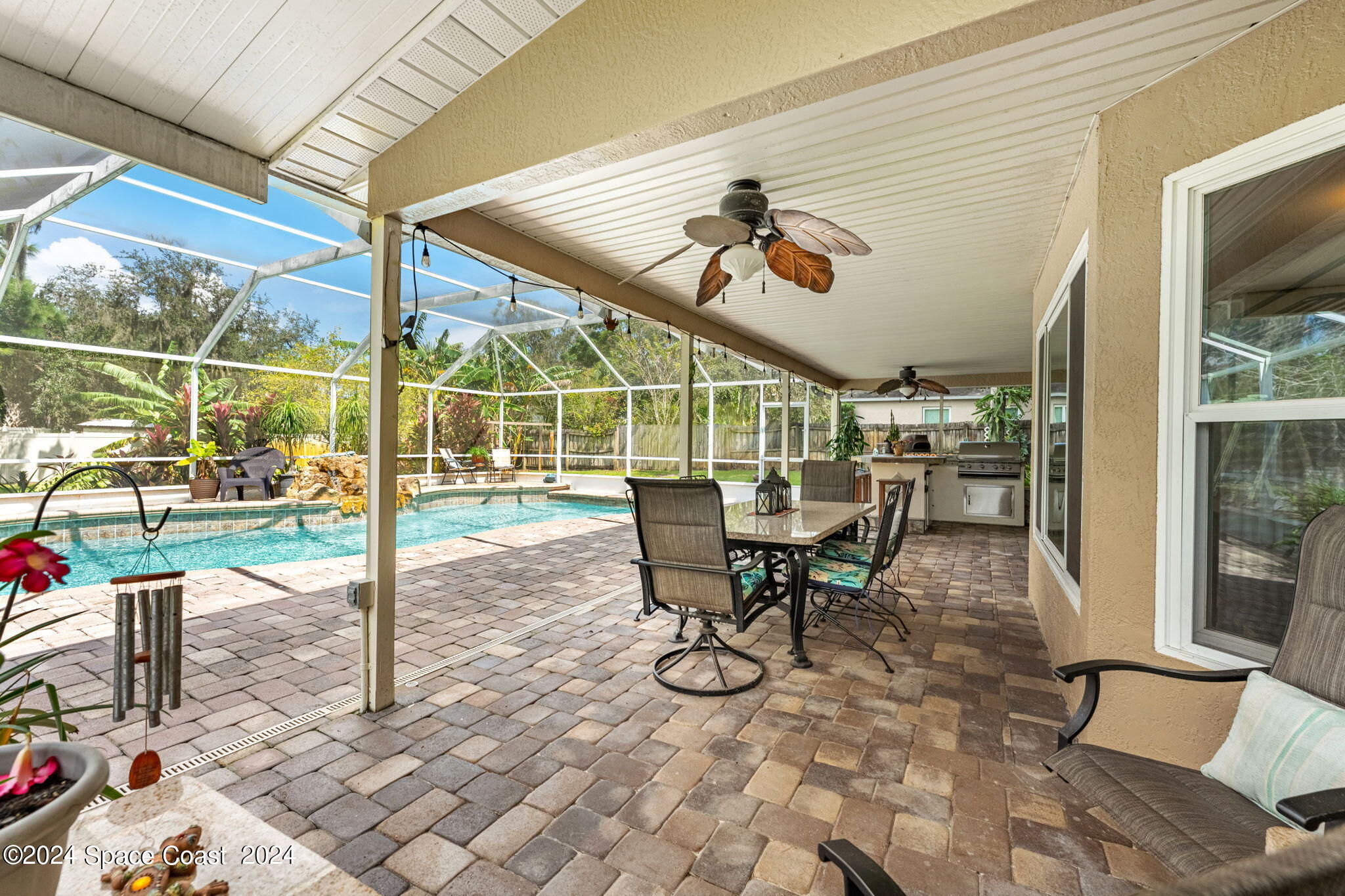 The outdoor living space is a true retreat, designed for both relaxation and entertainment. A fully screened pool enclosure provides year-round enjoyment of the pool, which was resurfaced in 2023 to ensure it remains a stunning focal point. Surrounded by a paved patio and framed by lush tropical greenery and towering oak trees, the outdoor area feels like a private oasis. The pool’s rock water fountain adds a tranquil touch, and a built-in baby gate ensures safety for younger family members. The patio, partially covered for shade, is perfect for outdoor dining or simply lounging by the pool. Two ceiling fans ensure comfort even during warmer months. The outdoor kitchen, complete with a stainless steel grill and refrigerator, invites you to indulge in alfresco dining, while the high-top counter space provides the perfect setting for hosting casual get-togethers. The backyard is vast and lush, with tropical plants, palm trees, and a well-constructed shed for additional storage, further enhancing the property’s functionality and beauty.