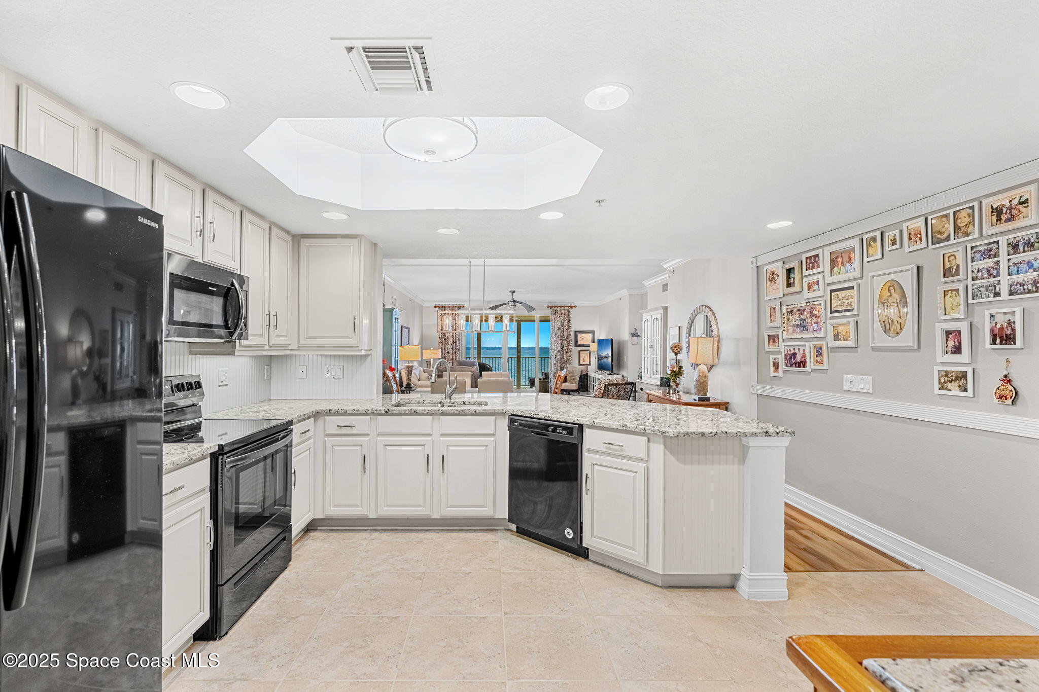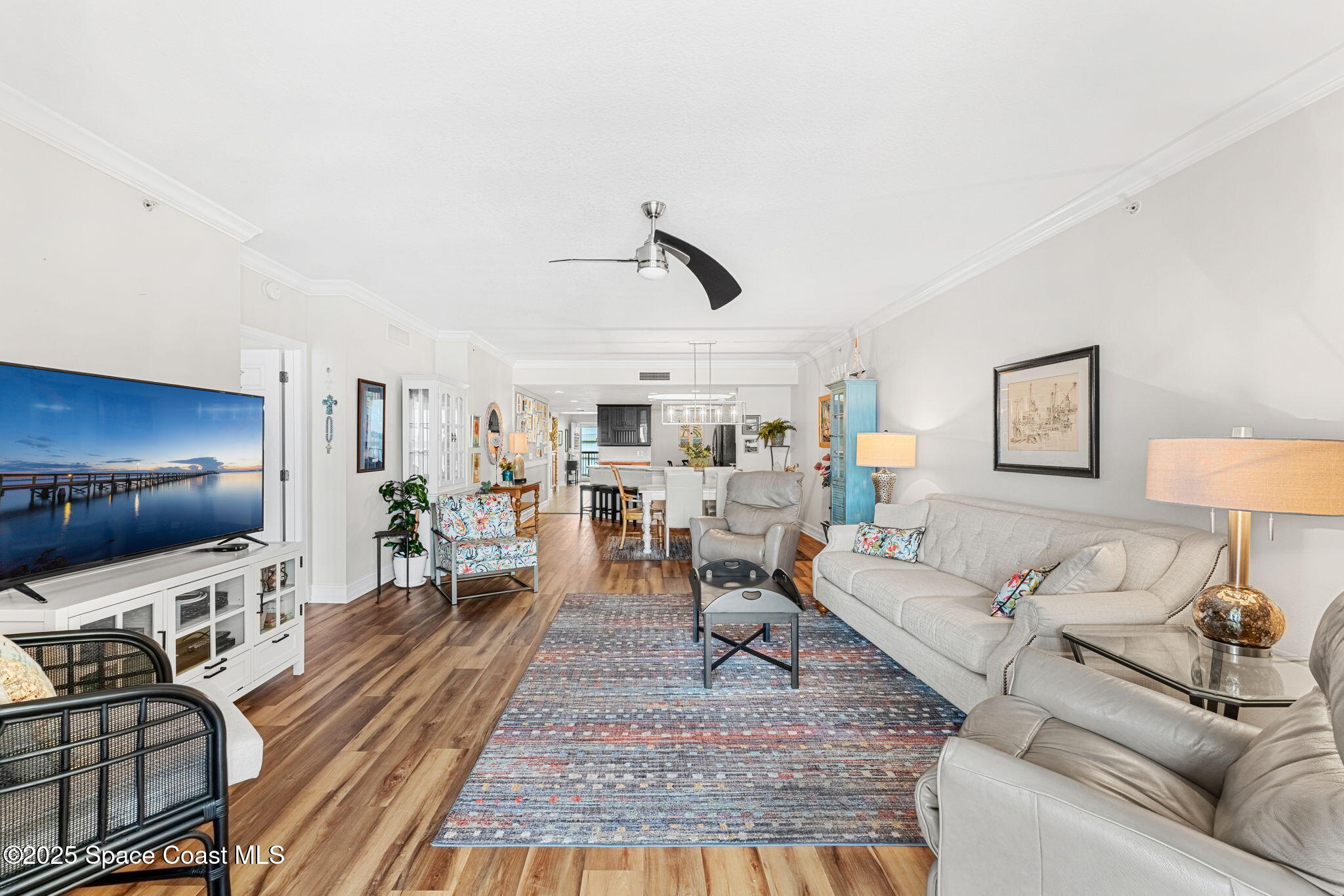 Designed for both relaxation and entertaining, the open-concept living and dining areas offer a warm, inviting atmosphere. The living room features rich Luxury Vinyl Plank flooring, a sleek two-blade ceiling fan, and hurricane-rated sliding glass doors that lead to a spacious balcony—your private front-row seat to riverfront serenity. Electronic roll-down hurricane shutters provide added peace of mind, while crown molding and a sophisticated silver light fixture elevate the dining space.