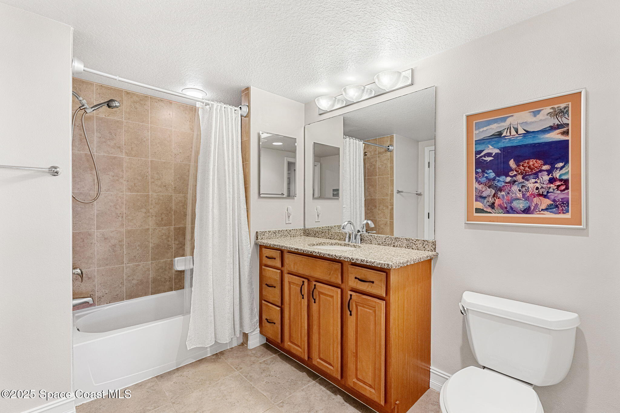 Bedrooms two and three are tucked near the front of the home, offering privacy and versatility. Bedroom two, currently an office, features two over-window shelving units, semi walk-in closets, white vinyl plantation shutters, and LVP flooring. Bedroom three enjoys pocket-door access to the guest bath, a thoughtful feature that enhances guest comfort. Also offering hallway access, this bath is beautifully appointed with a granite vanity, oak cabinetry, and a tub-shower combination framed by tan-colored tile.