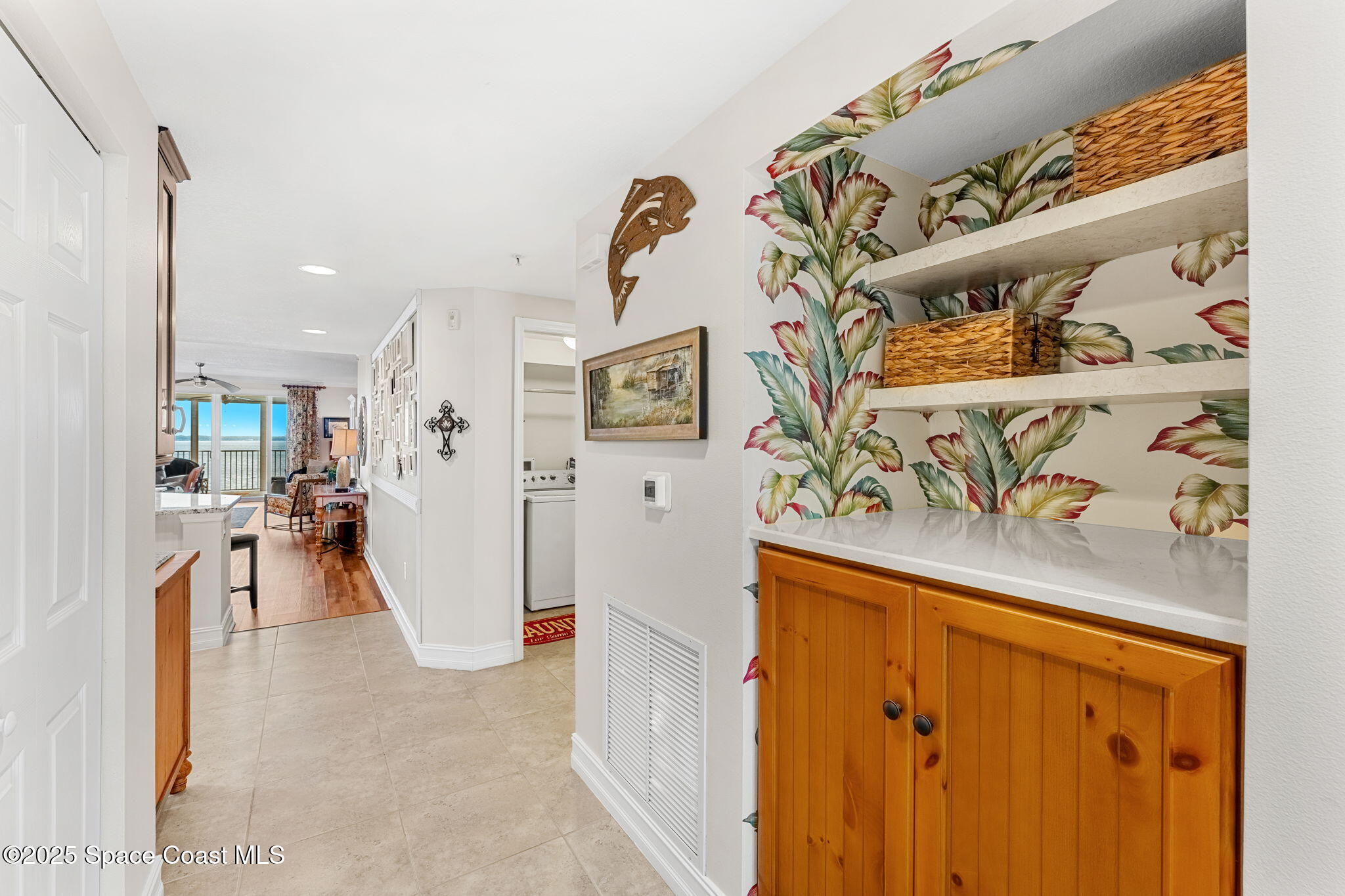 Perfectly blending function with style, the kitchen boasts off-white cabinetry, granite countertops, and a distinctive wainscoting backsplash. The wraparound bar offers ample seating, creating a natural gathering spot for friends and family. Black Frigidaire appliances, recessed lighting, a double-sided stainless-steel sink, and a charming coffee station with a granite and wood butler’s bar complete this inviting space. A black upper cabinetry display, floating shelves in the dining nook, and a beverage refrigerator add character and convenience. Just steps away, a stylish dry bar with open shelving, white quartz countertops, and decorative palm wallpaper enhances the home’s effortless elegance. This built-in space could also be used as a handy drop-off spot for keys and beach bags, or as a display case for favorite coastal treasures.