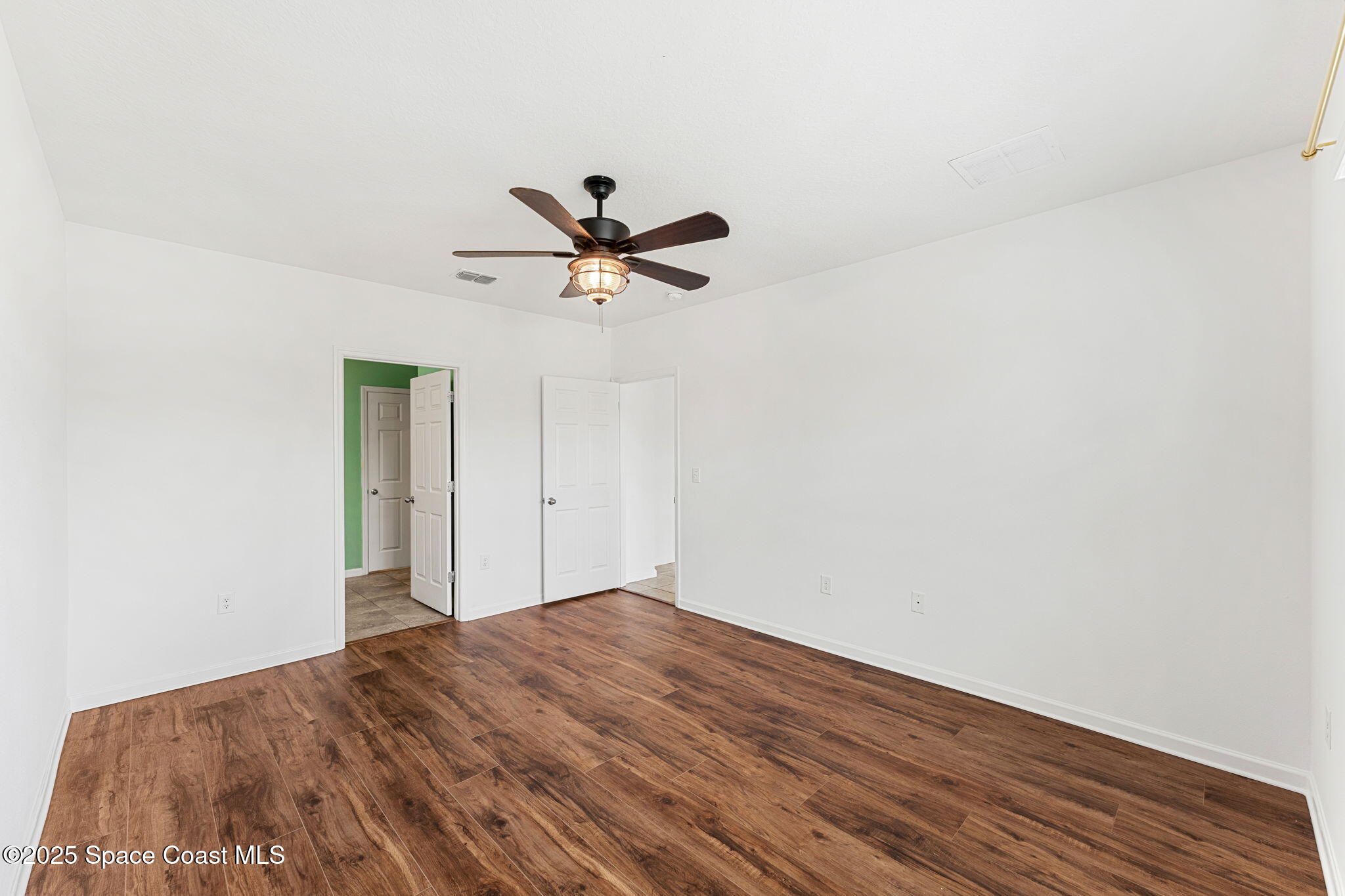 Tucked away in its own quiet wing, the Primary Suite is a calming retreat with wood-look floors, soft natural light, and serene backyard views. The en suite bath features dual sinks, an oversized mirror, and a glass-enclosed walk-in shower—ideal for unwinding at the end of a long day. A spacious walk-in closet completes the suite with room to spare. Across the home, three additional bedrooms share access to a full bath and can flex to fit your lifestyle—whether you're building a guest suite, a home office, or a playroom for little ones.