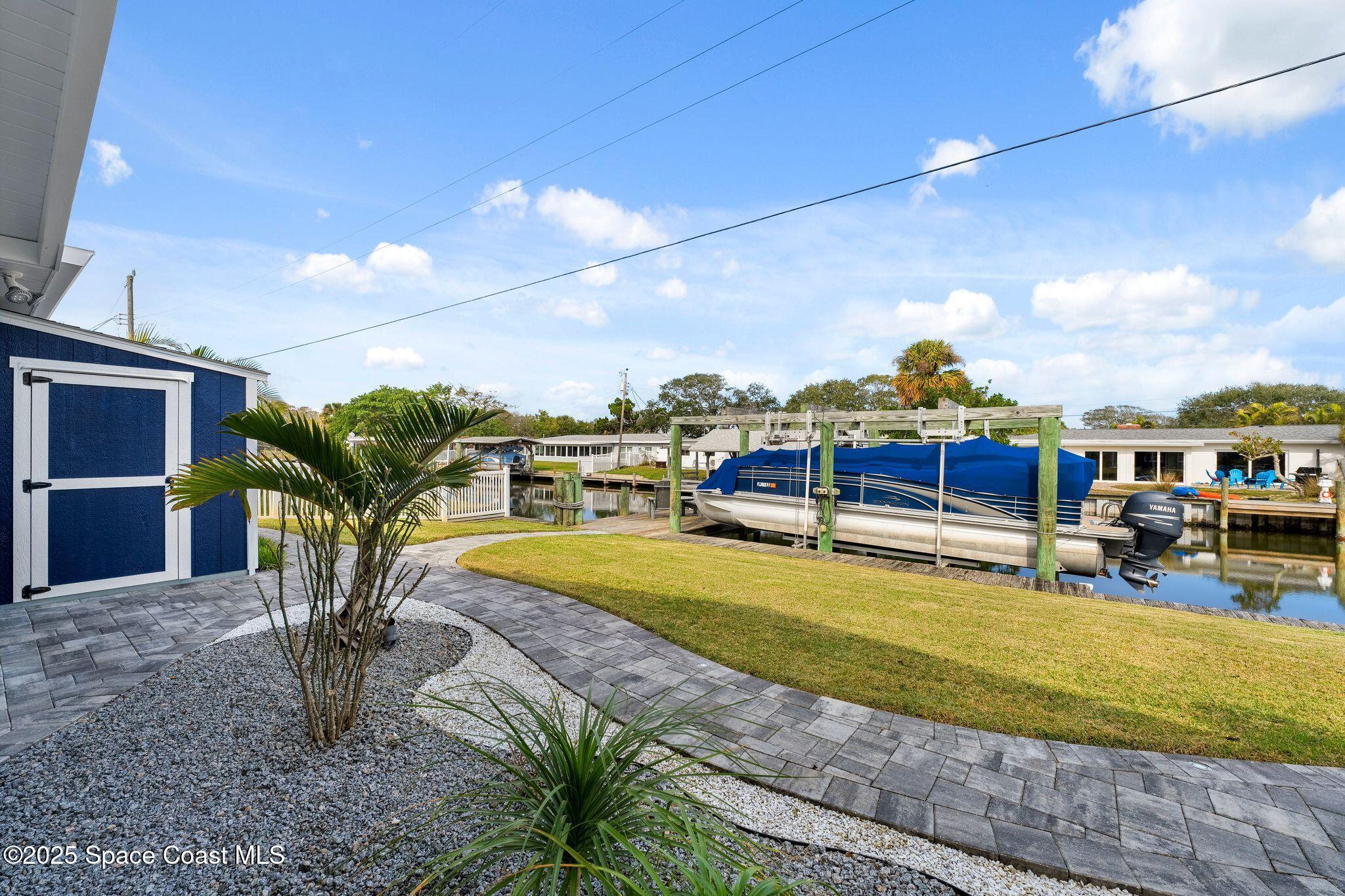 Bring your boat and water toys--this home is designed for adventure! Featuring a newer seawall, private boat dock, and lift, you'll enjoy peace of mind and effortless access to the open water. Imagine starting your mornings with a coffee on your covered lanai, watching dolphins and manatees glide by, or ending the day with breathtaking sunsets or year-round rocket launches from your private backyard oasis. Meticulously updated from top to bottom, this home boasts a 324 sq. ft. addition, providing a dedicated office with built-in cabinetry and closet and a functional indoor laundry room featuring generous cabinets with plenty of folding and hanging space and a sink for convenience. The gourmet chef's kitchen is a showstopper, featuring newer appliances, a spacious island, an induction cooktop, a built-in microwave, and high-end fixturesall overlooking your tranquil outdoor retreat.