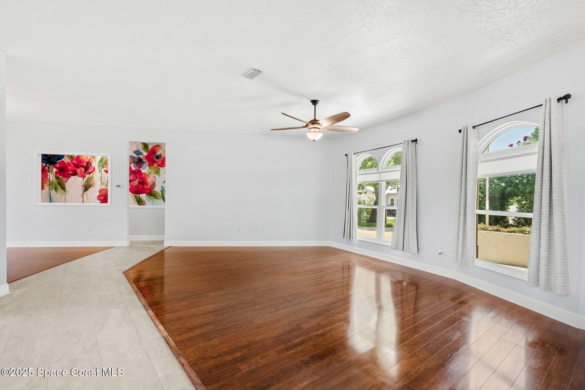 Tucked along a quiet street in one of Titusville’s most enduring neighborhoods, this nearly 2,500-square-foot residence is anything but conventional. From the street, its presence is striking: a bold red double door beneath an elegant covered portico, flanked by symmetrical arched windows and framed by tidy landscaping. The wide drive and oversized three-car garage hint at the space to come, but it's the interior that truly surprises. Skylights draw daylight from above, casting a warm glow across rich wood-look laminate flooring and polished ceramic tile. Tall ceilings and generous proportions immediately evoke a sense of openness, while subtle architectural elements—arched transitions, recessed lighting, and curated fixtures—lend a quiet sophistication.